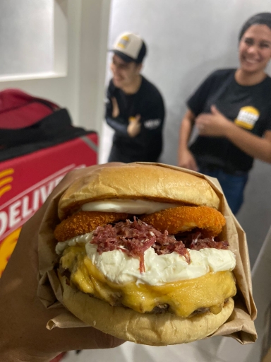 Descrição: Pão brioche, Bife artesanal grelhado (160g) , Onions rings(anéis de cebola empanado), Bacon ,creme Cheddar da casa e queijo prato ! **Carne no ponto da casa: suculento Acompanha maionese da casa